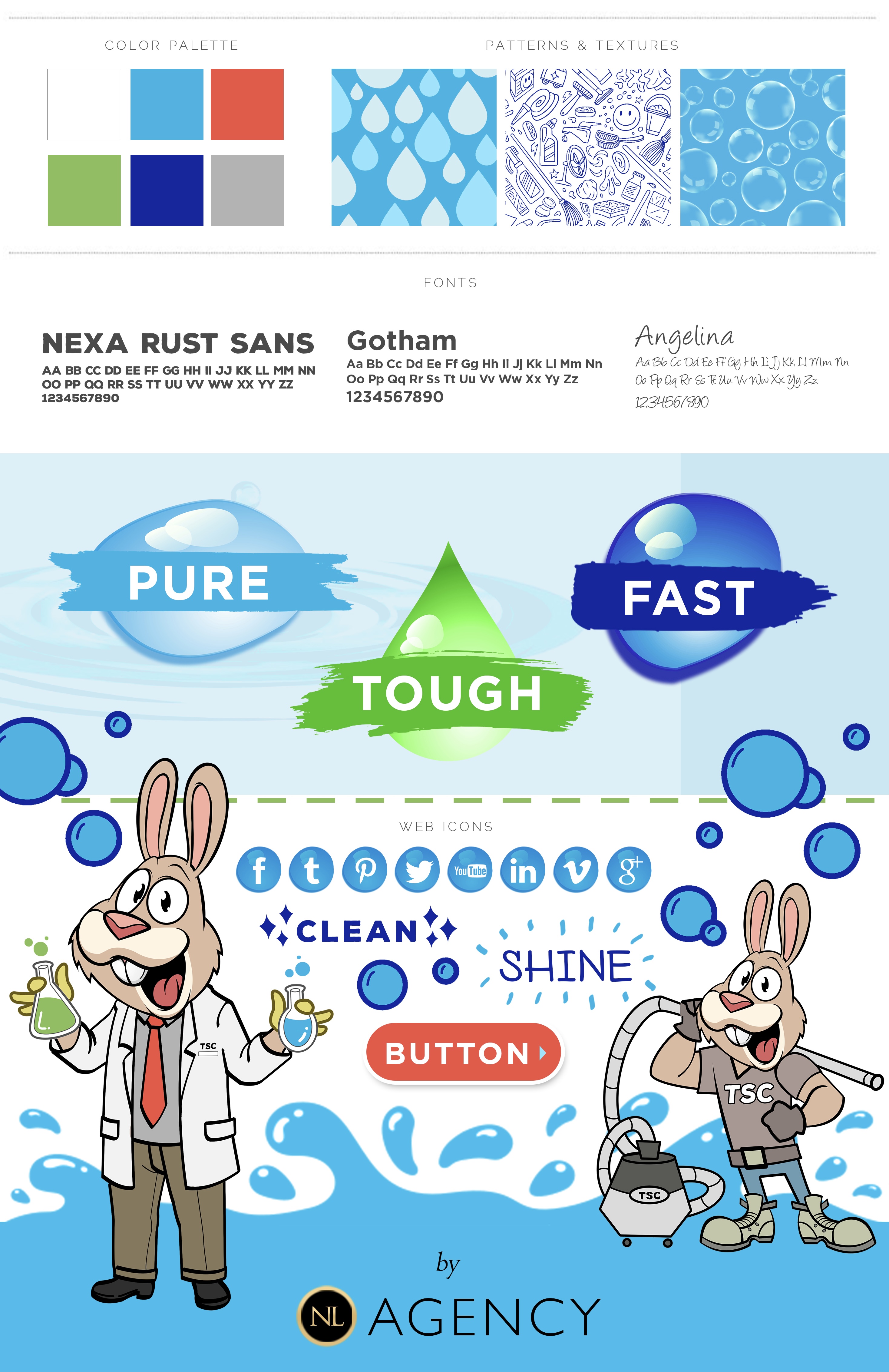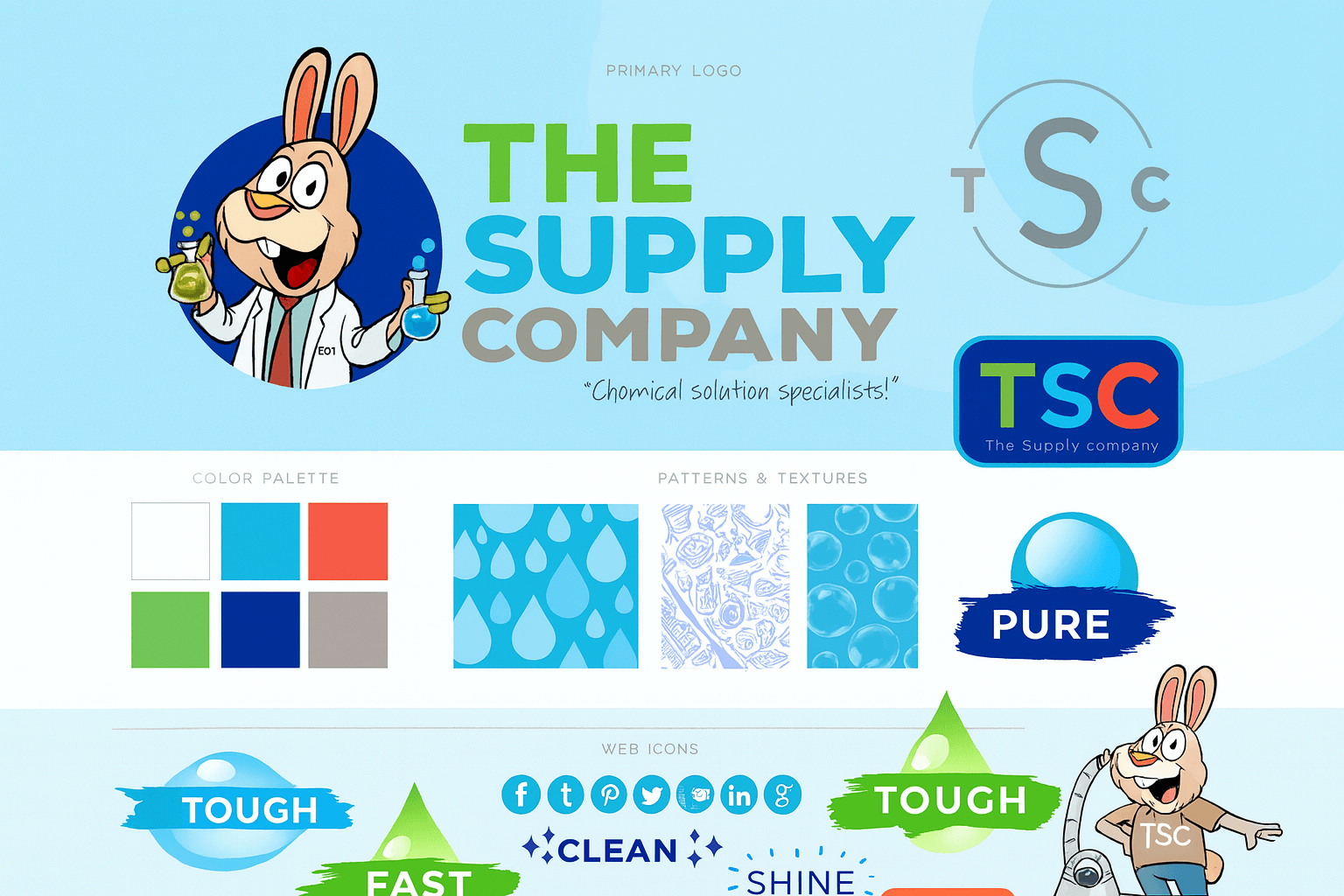TSC approached us to craft a bold, energetic brand identity matches their powerful line of industrial-grade cleaning products. We developed a fuil branding system with playful character, vibrant colors, and approachable illustration style.